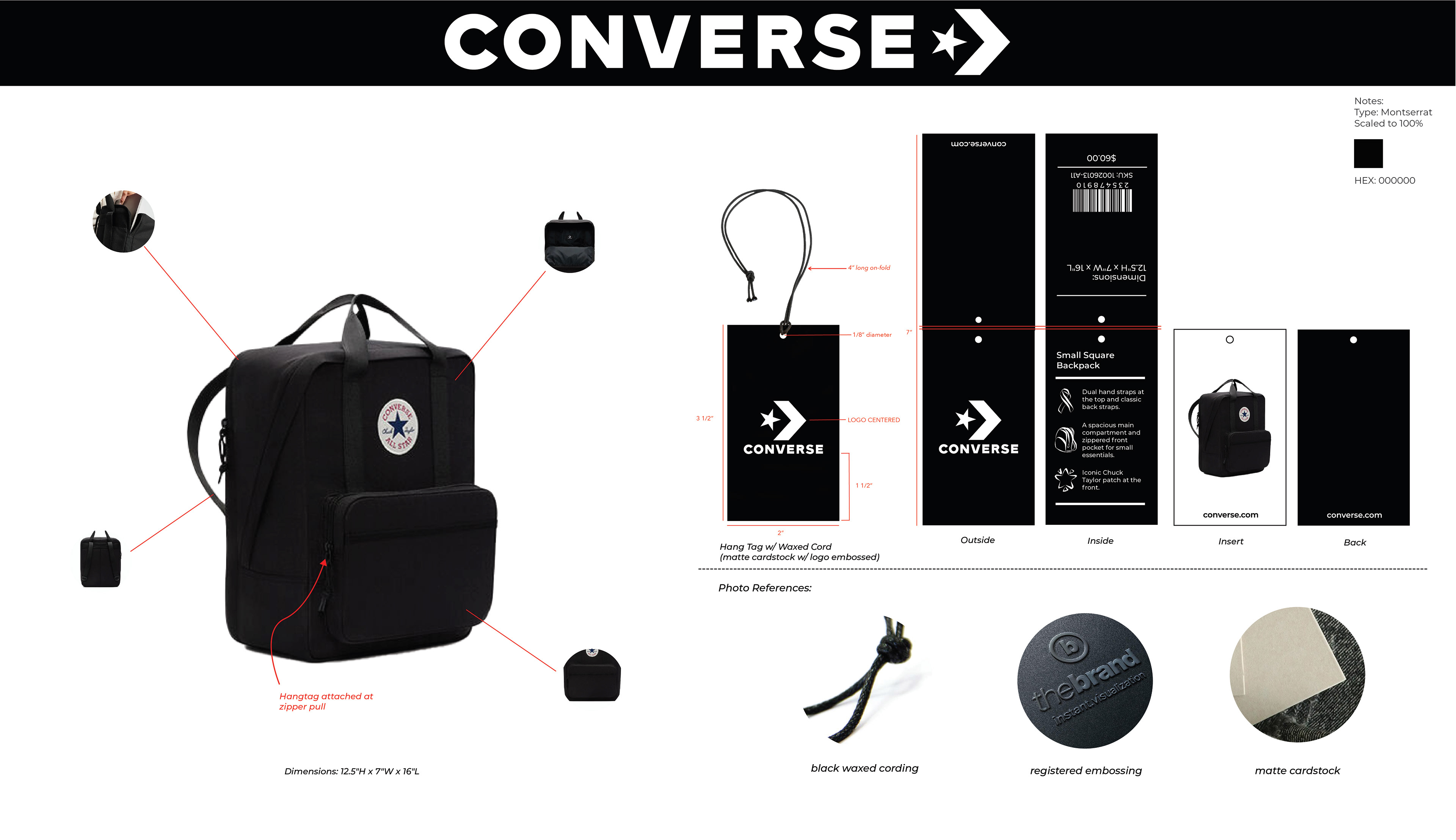 We collaborated with Converse to design a clamshell-style hangtag for their Small Square Backpack, blending functionality with bold brand storytelling. The goal was to develop a mechanical art layout that visually communicates the backpack’s features while staying true to Converse’s iconic aesthetic. We created two custom designs—one for each colorway, Lavender Trek and Converse Black—using high-resolution product imagery, custom iconography, and flexible layouts. The final hangtags clearly highlight features like dual strap options, spacious compartments, and the classic Chuck Taylor patch, resulting in an elevated in-store presentation that informs and excites the customer.