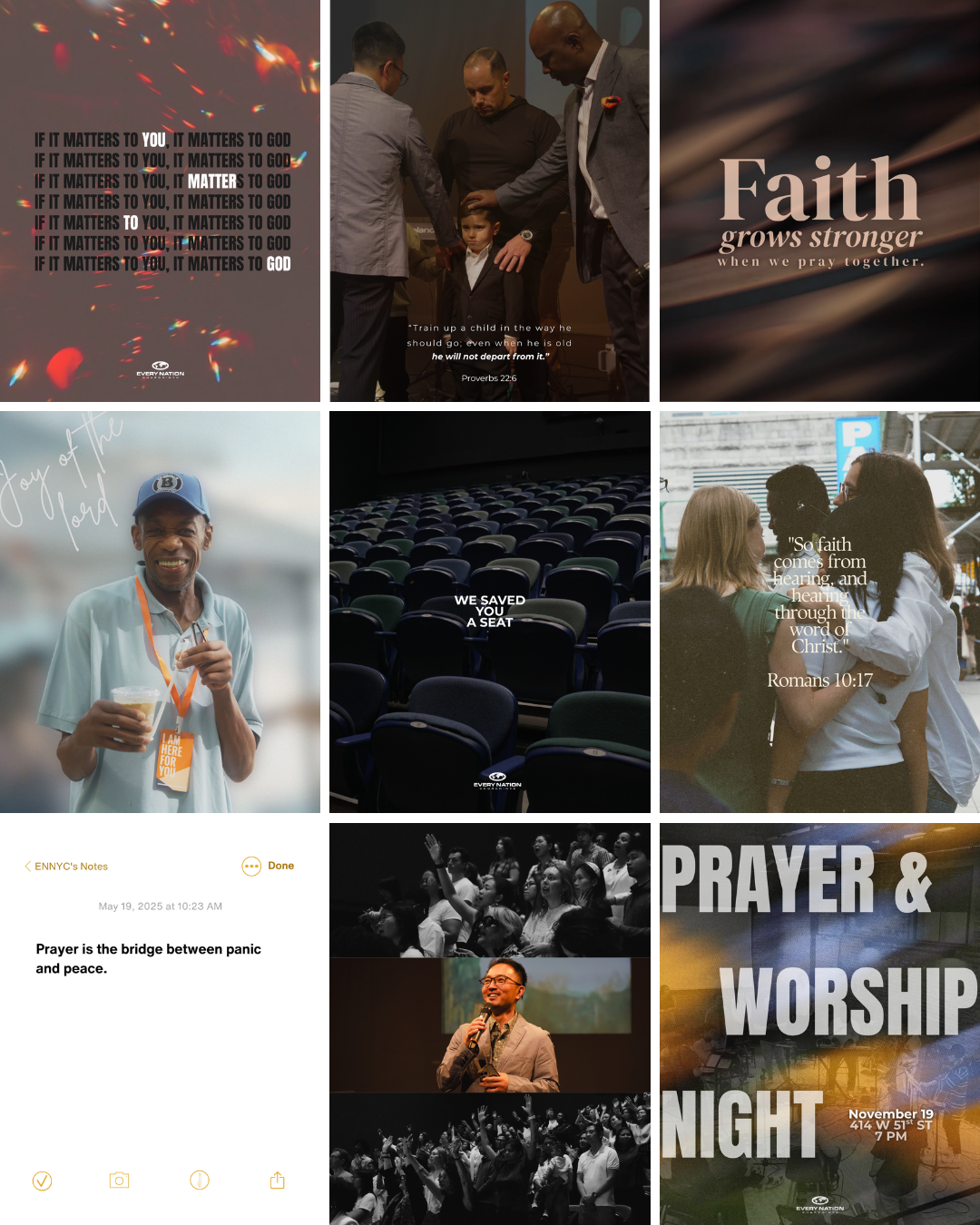 We’ve been partnering with Every Nation Church NYC to strengthen their digital presence through strategic social media management, photography, and visual storytelling. From designing branding assets that reflect the heart of their mission to creating engaging content for social media, we help bring their message to life online. Our work includes producing custom graphics, videos, and captions tailored for their instagram, as well as print materials such as posters, bookmarks, and banners for outreach campaigns .